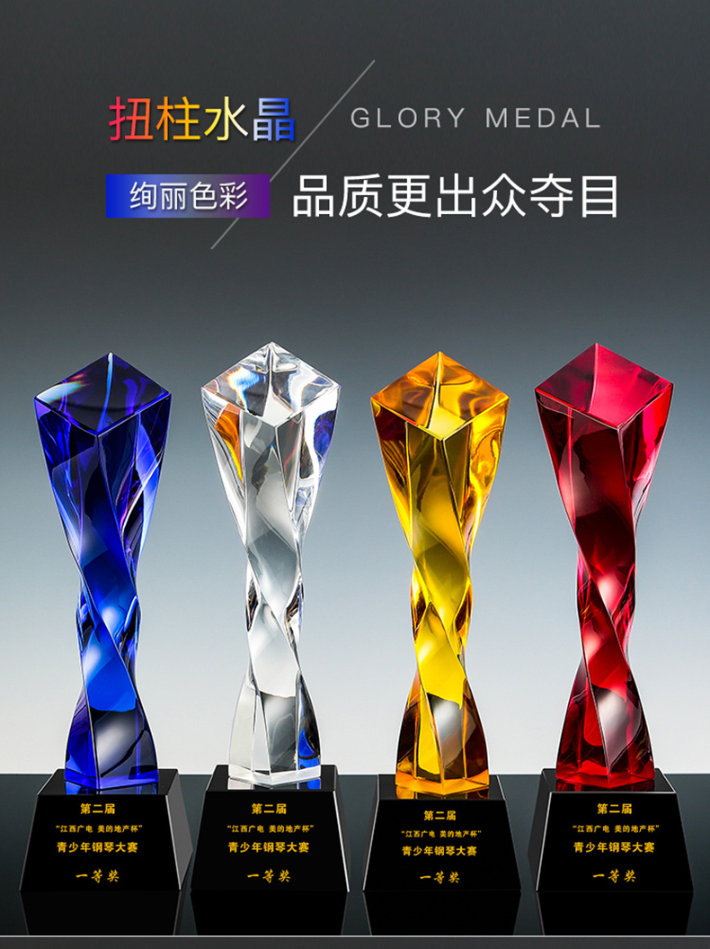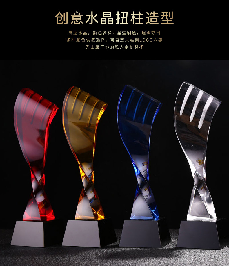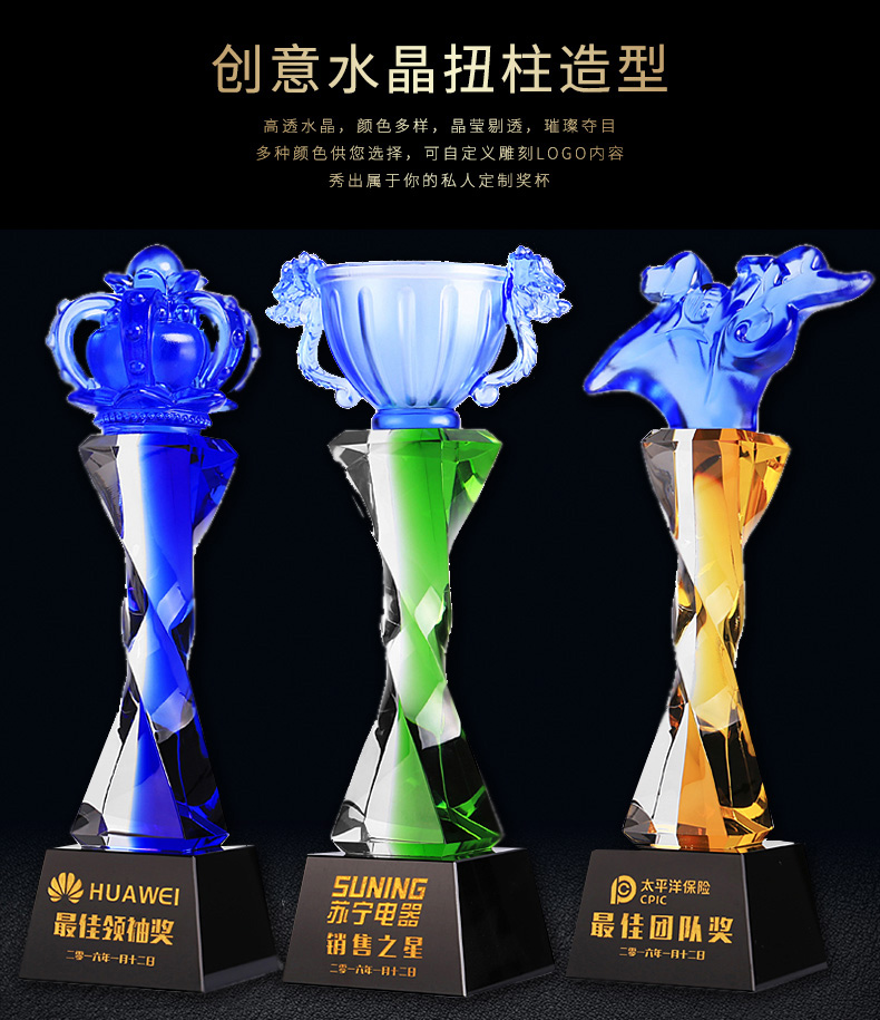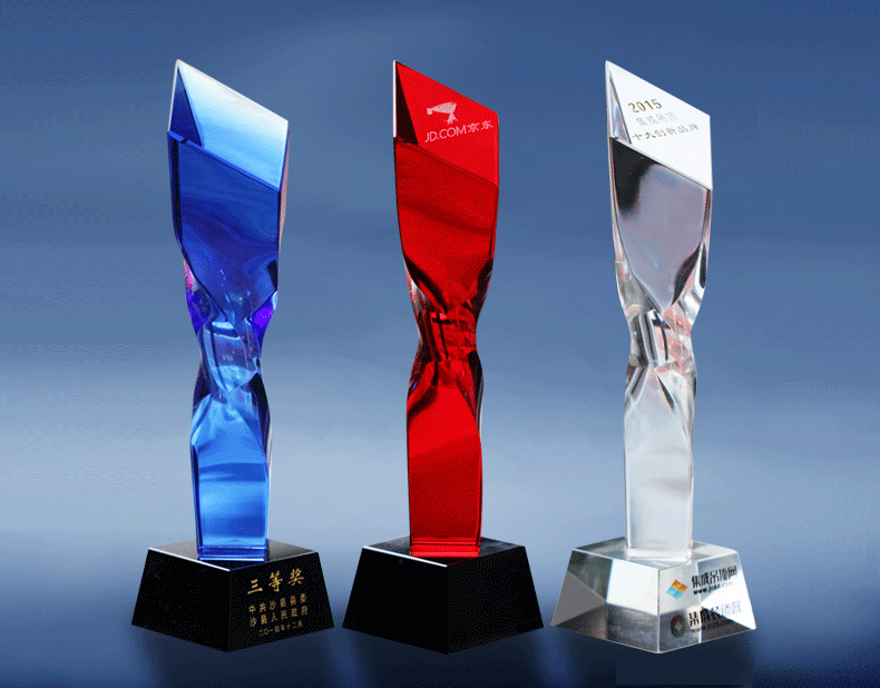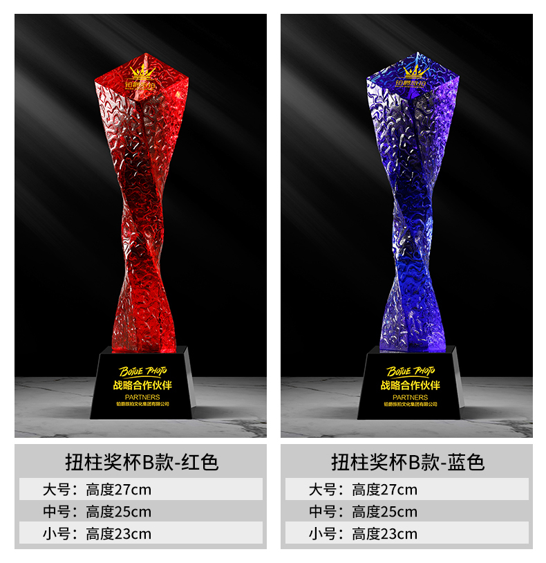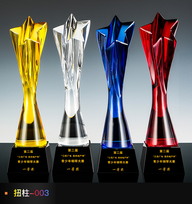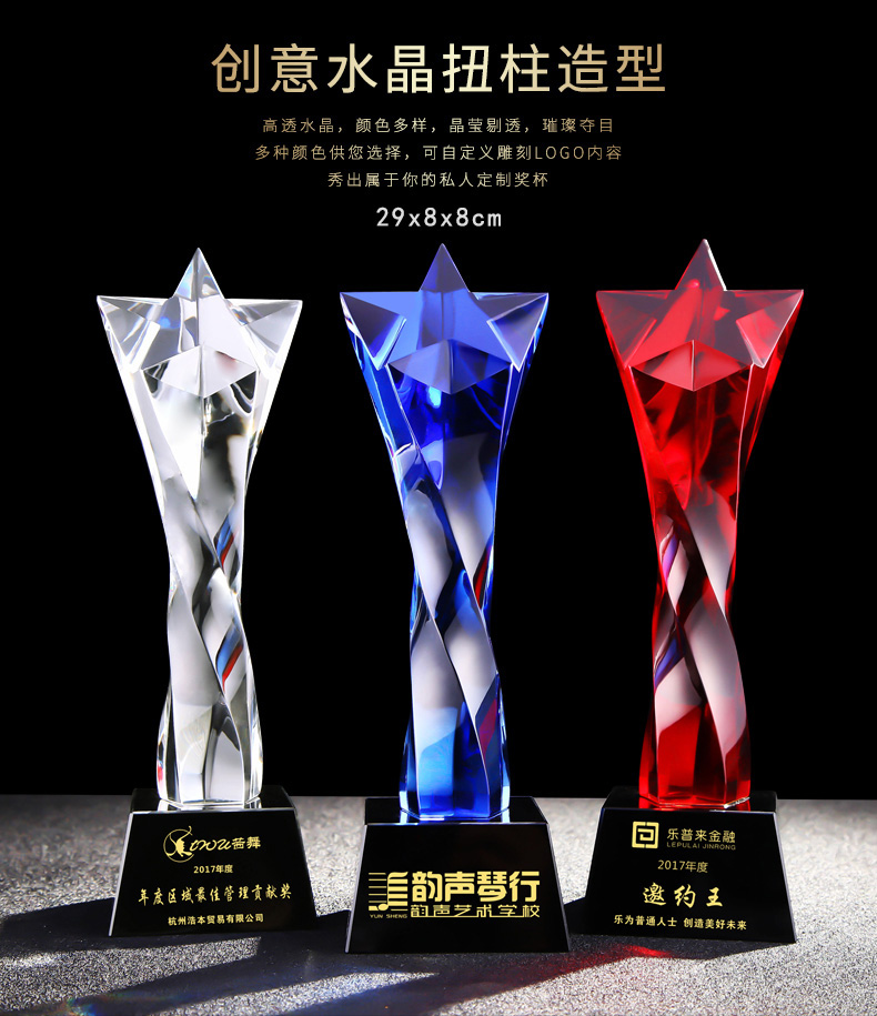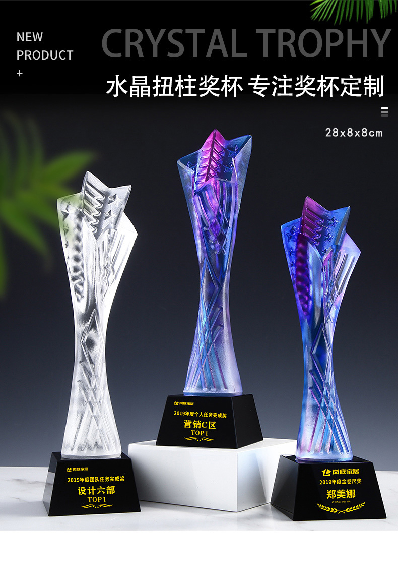 1002 / 蓝色红色扭柱高档五角星水晶奖杯定制企业优秀员工比赛创意奖牌定做