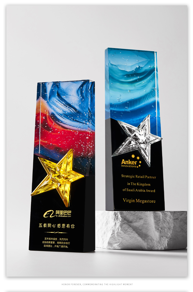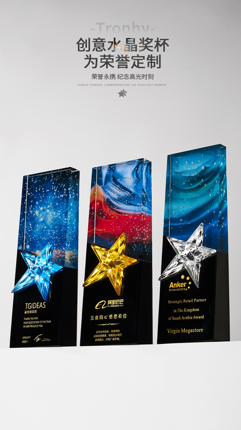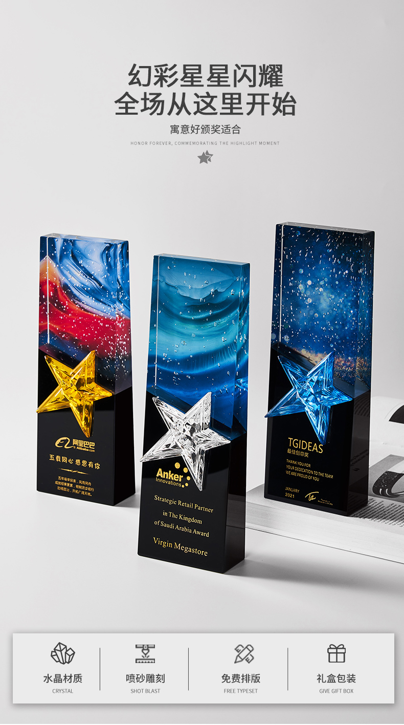 1034 / 高档大气炫彩水晶五角星奖杯定制创意刻字优秀员工颁奖表彰牌订制
