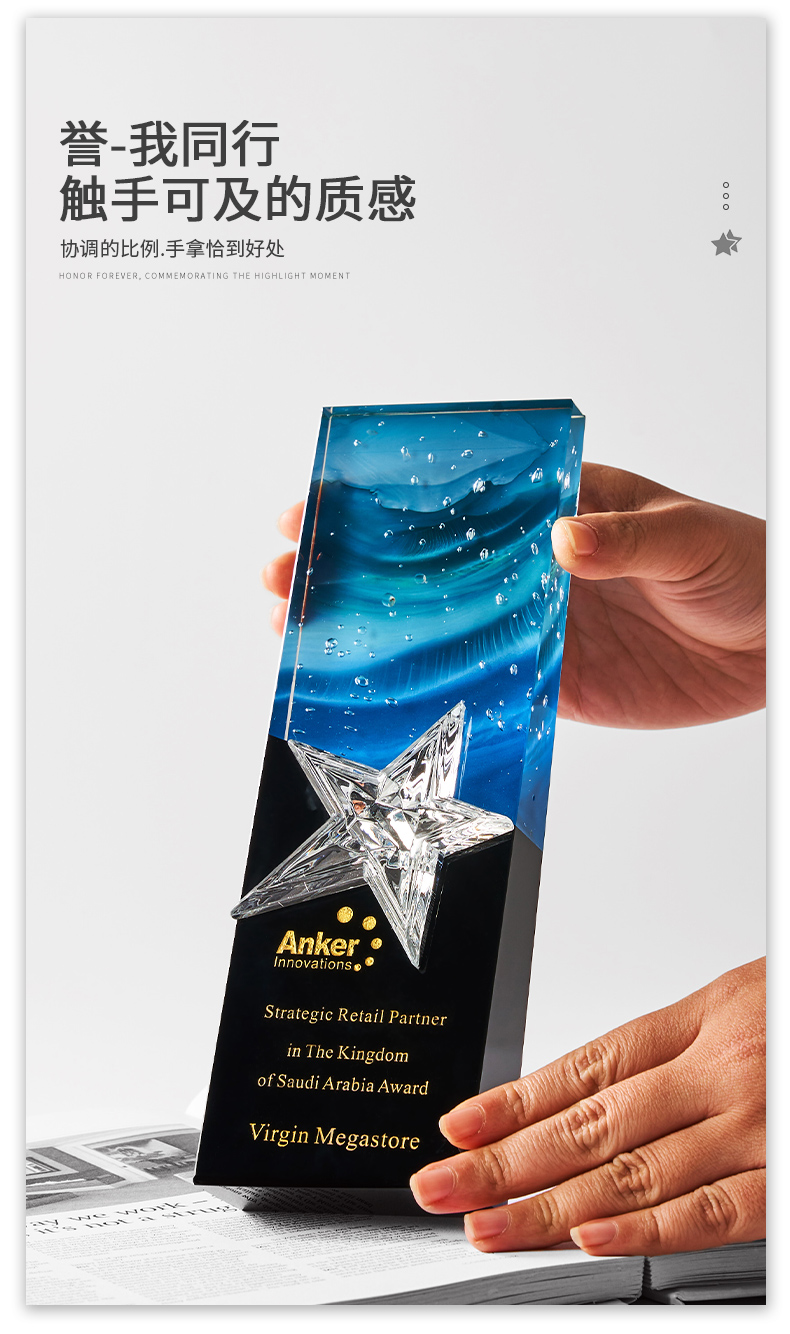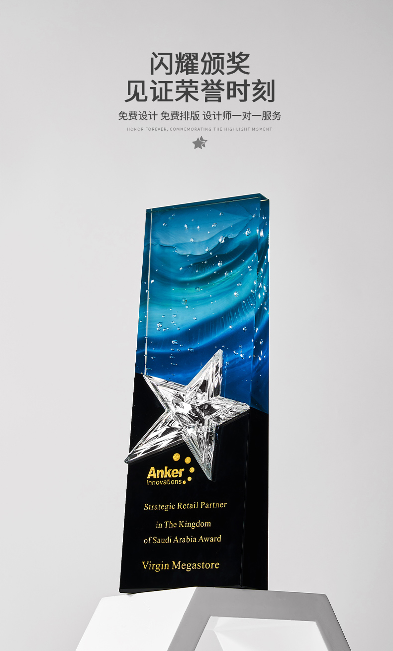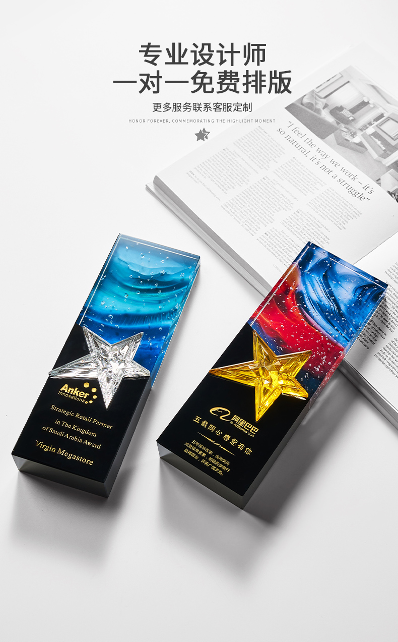 1034 / 高档大气炫彩水晶五角星奖杯定制创意刻字优秀员工颁奖表彰牌订制