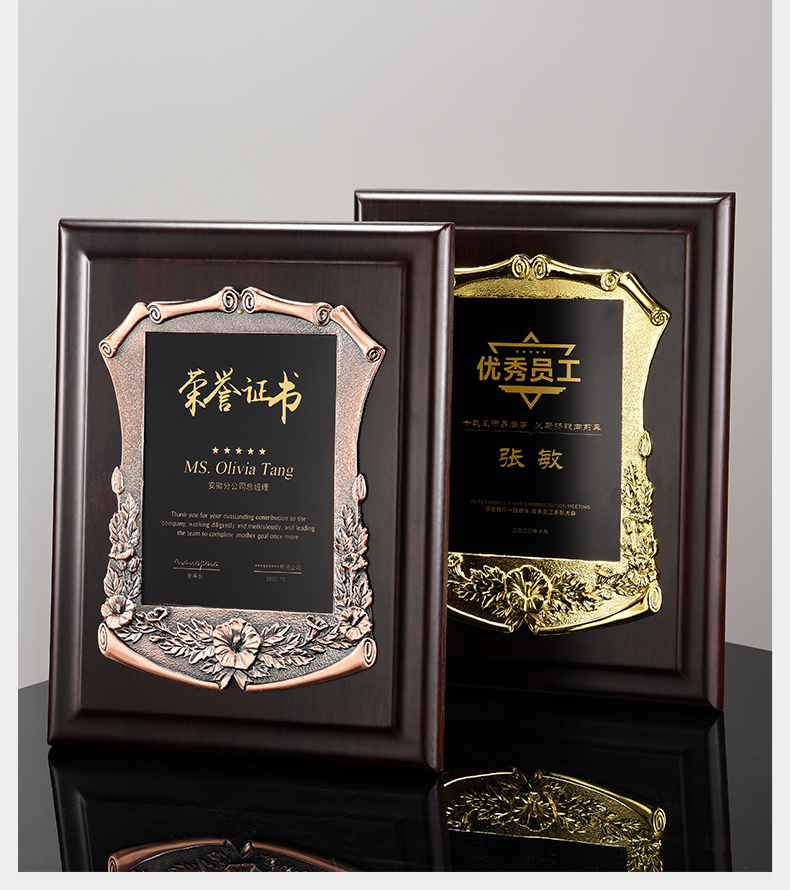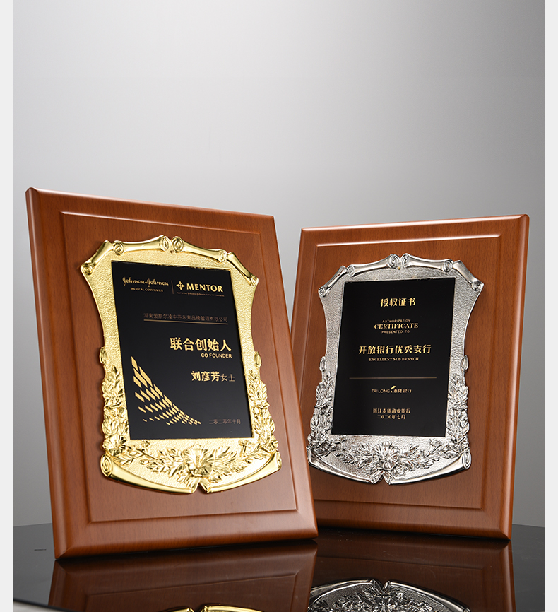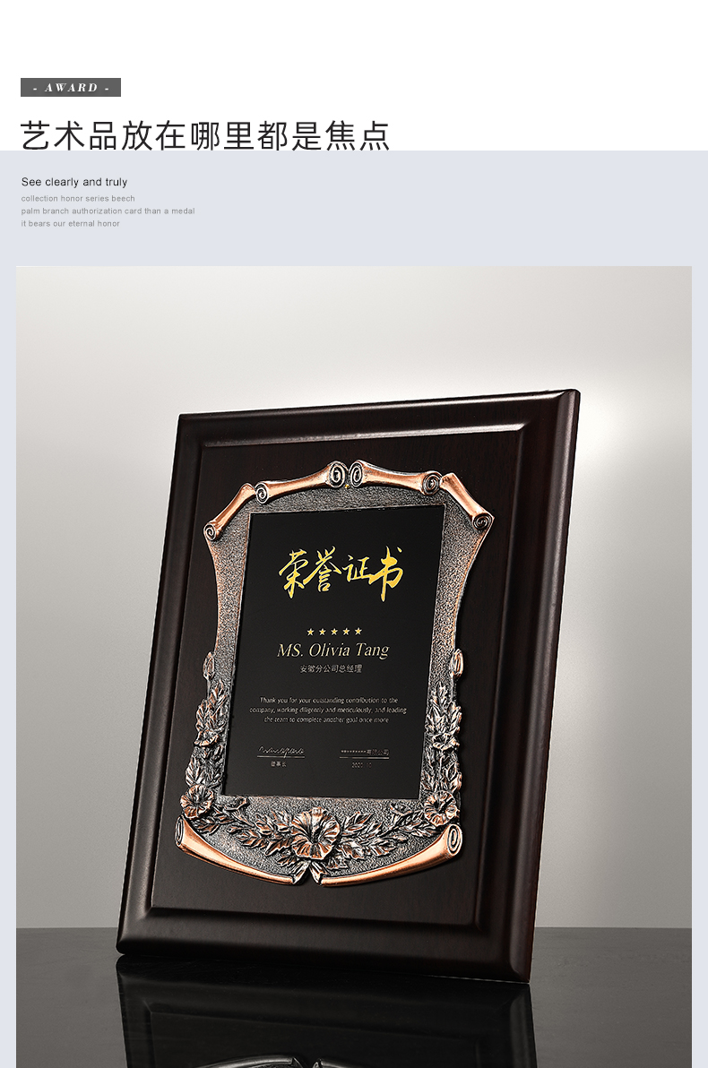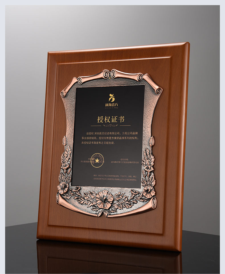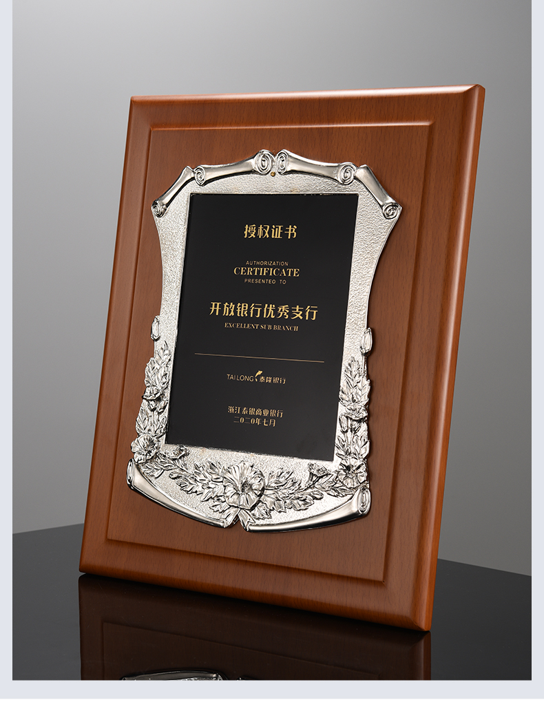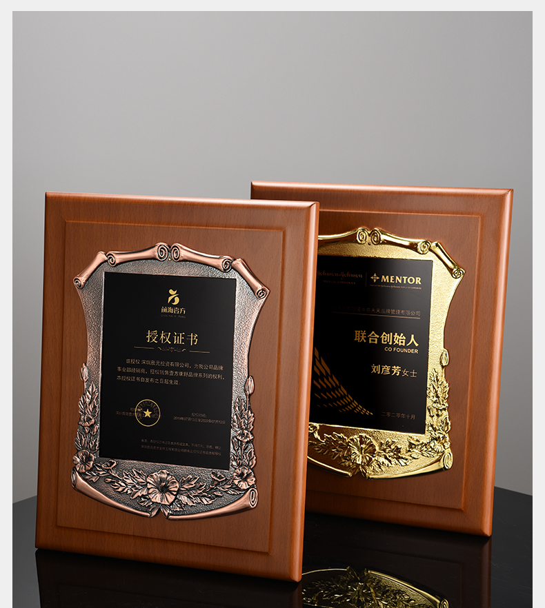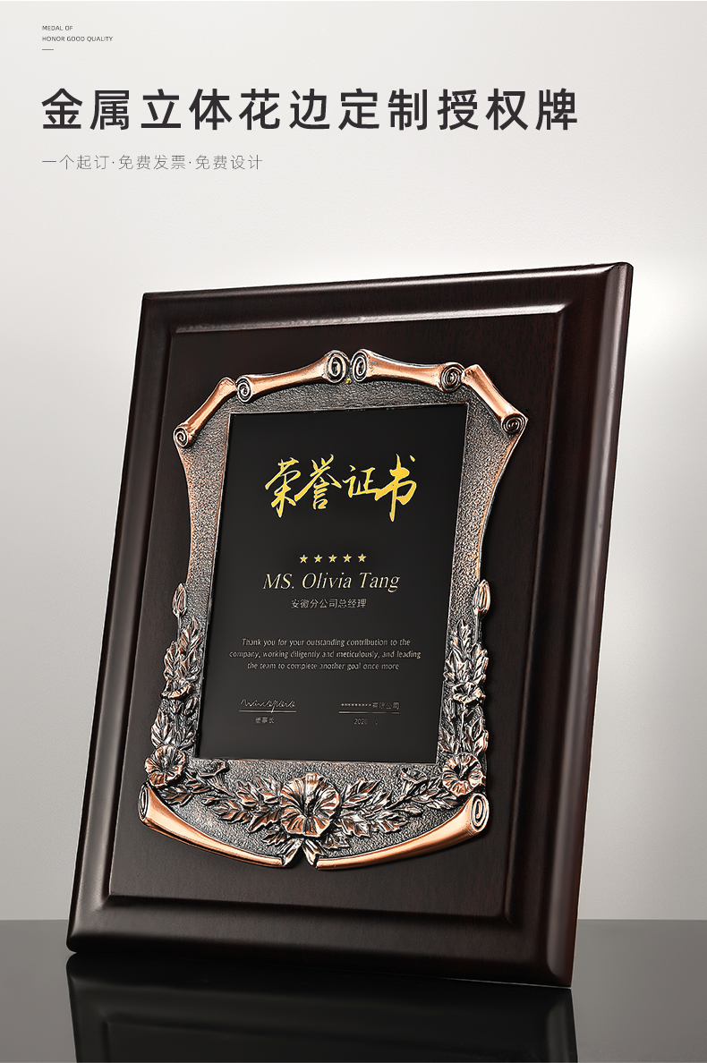 542 / 水晶奖牌定制金属框金箔荣誉授权牌代理加盟商牌匾木质奖杯定做