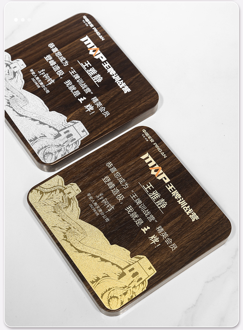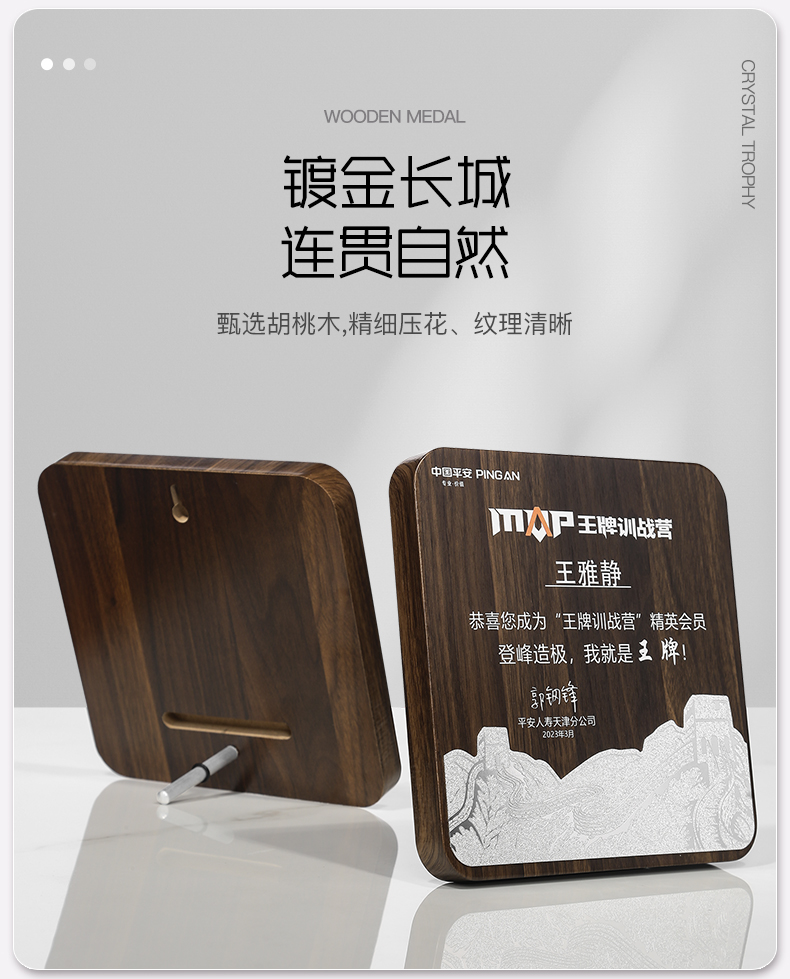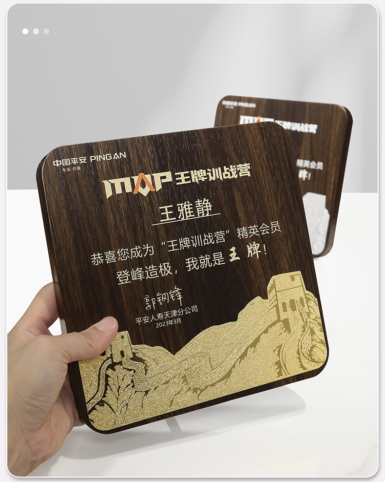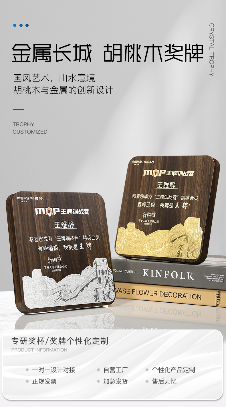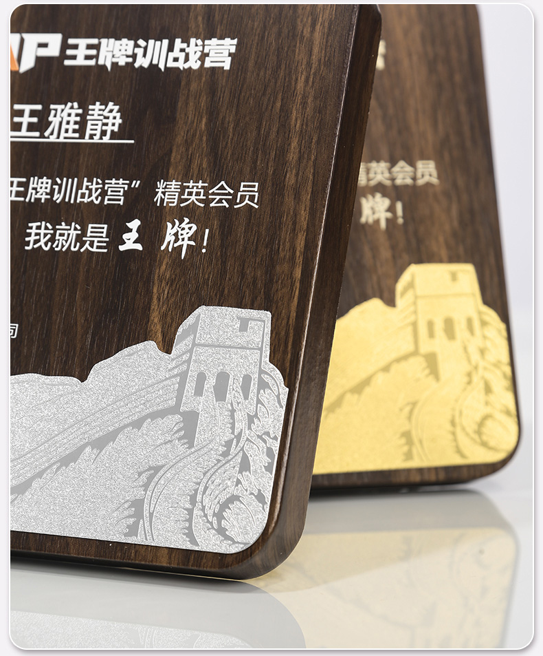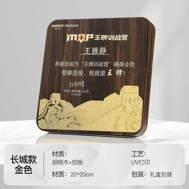 515 / 金属长城胡桃木奖牌木质奖牌定制胡桃实木加盟牌匾代理商金箔授权牌荣誉退休铜牌定做