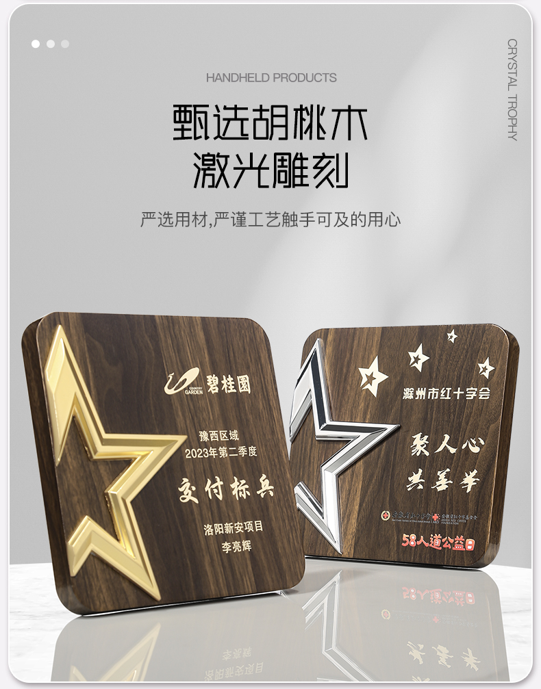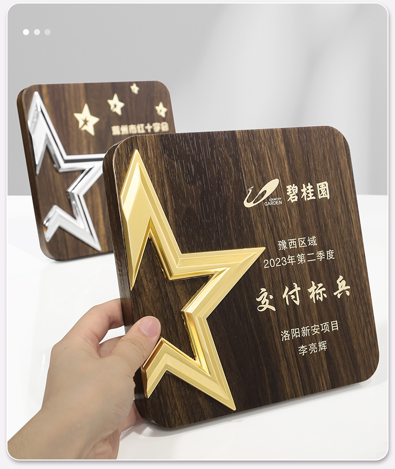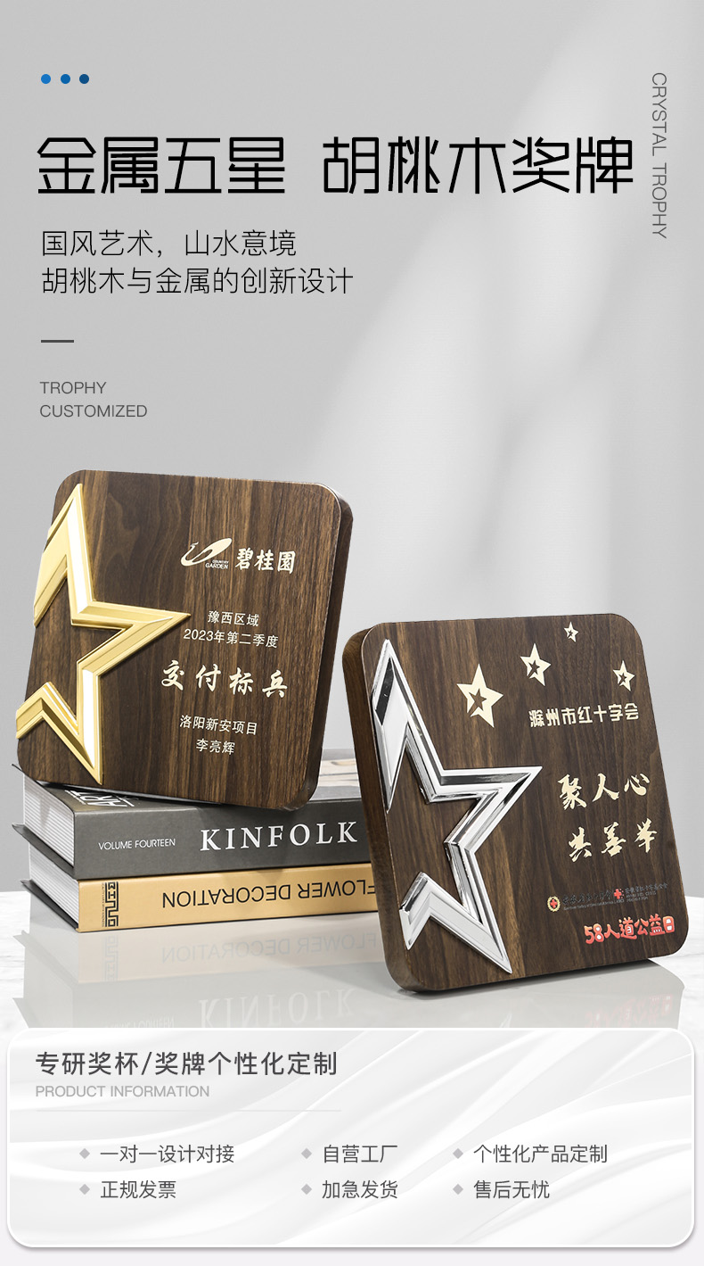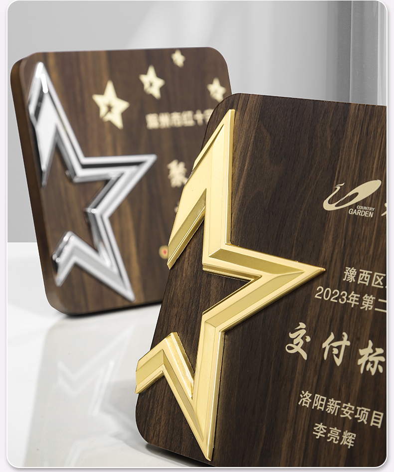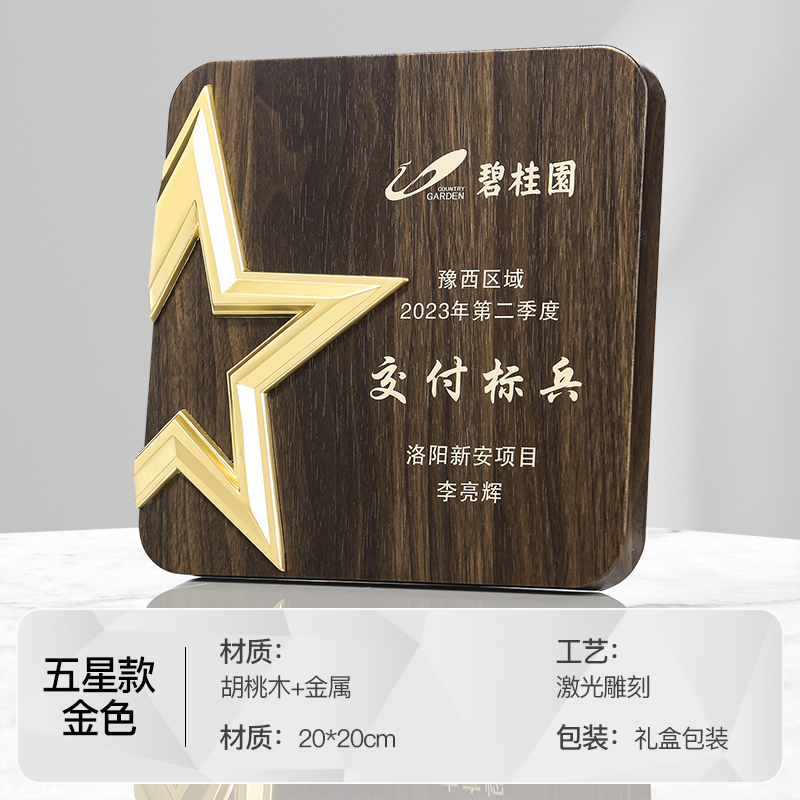 513 / 金属五星胡桃木奖牌木质奖牌定制胡桃实木加盟牌匾代理商金箔授权牌荣誉退休铜牌定做