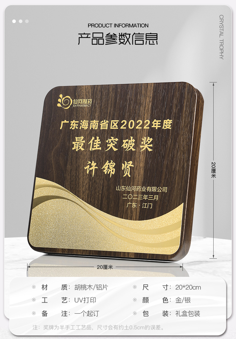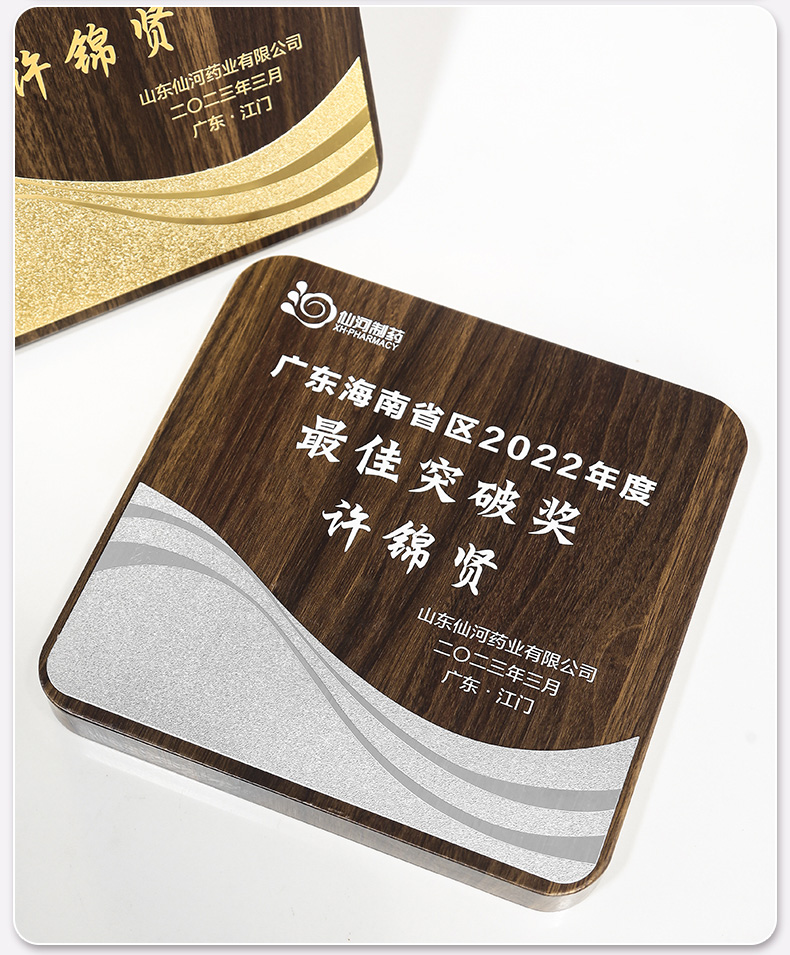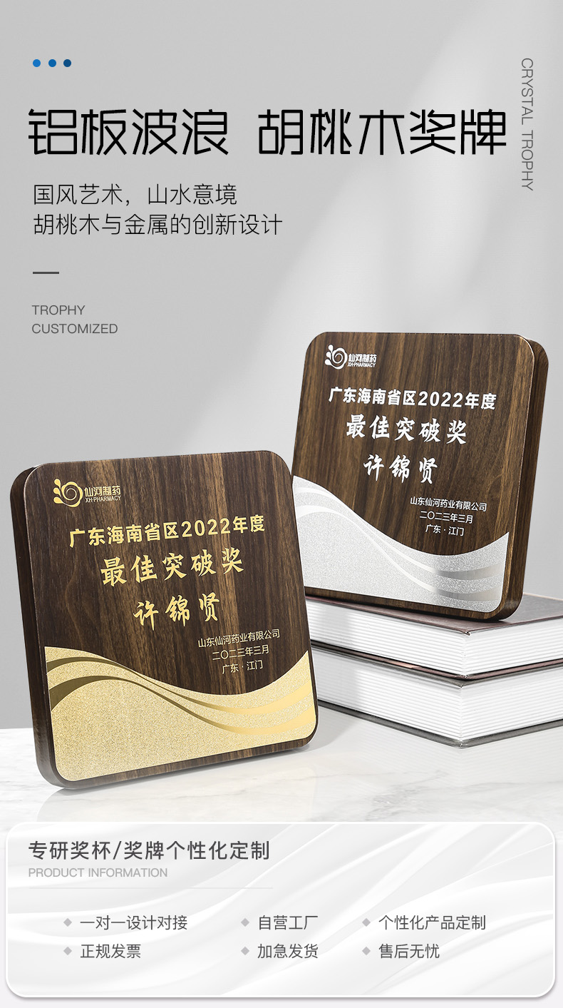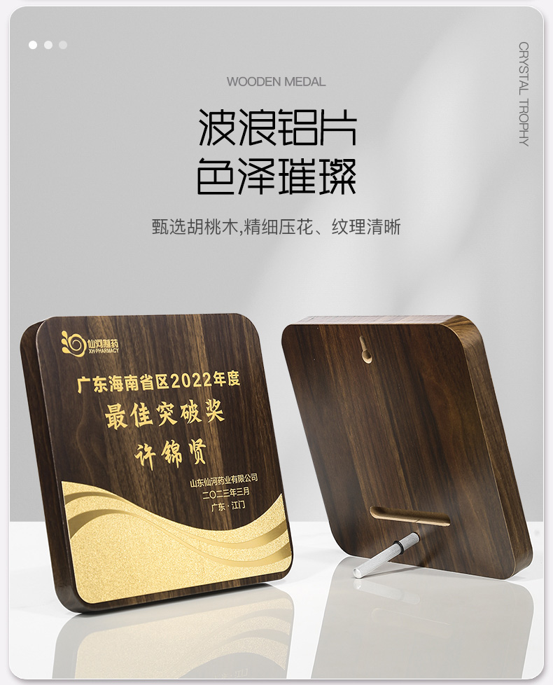514 / 金属波浪胡桃木奖牌木质奖牌定制胡桃实木加盟牌匾代理商金箔授权牌荣誉退休铜牌定做