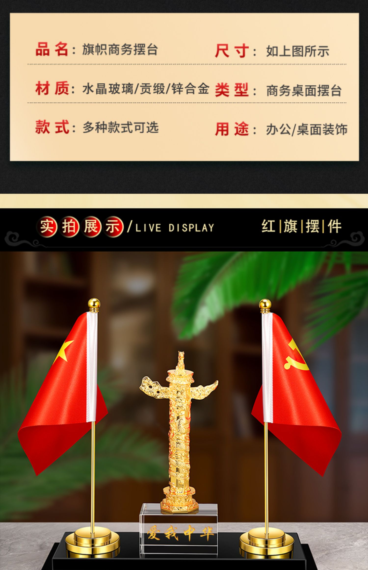 903 / 【办公三件套】高档党旗国旗办公桌面水晶摆件国旗老板办公室桌旗文台收纳会议室桌面装饰品旗座旗子五星