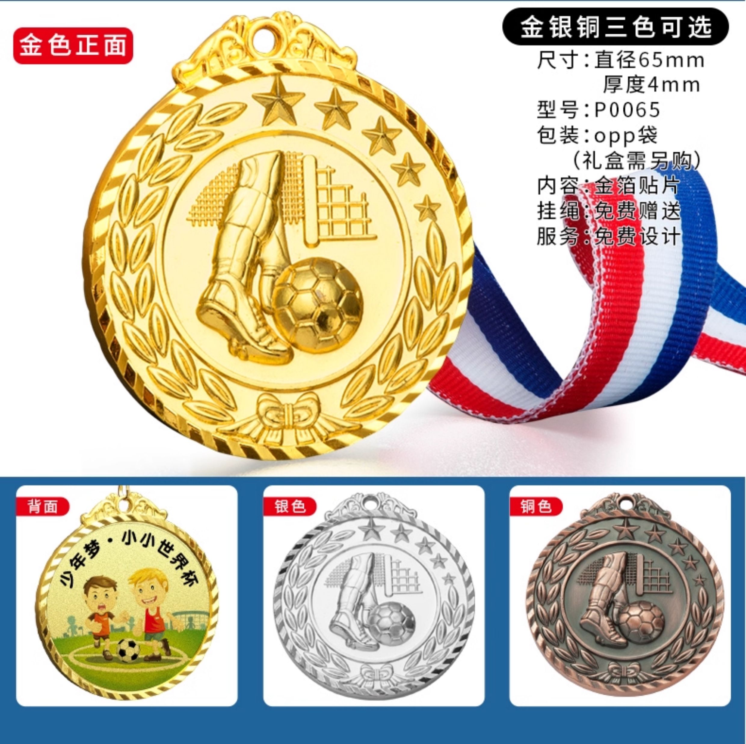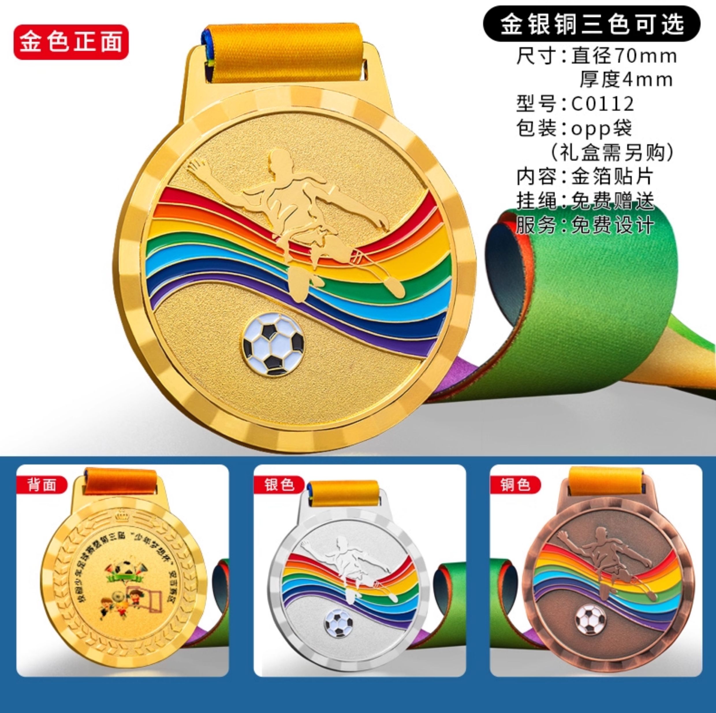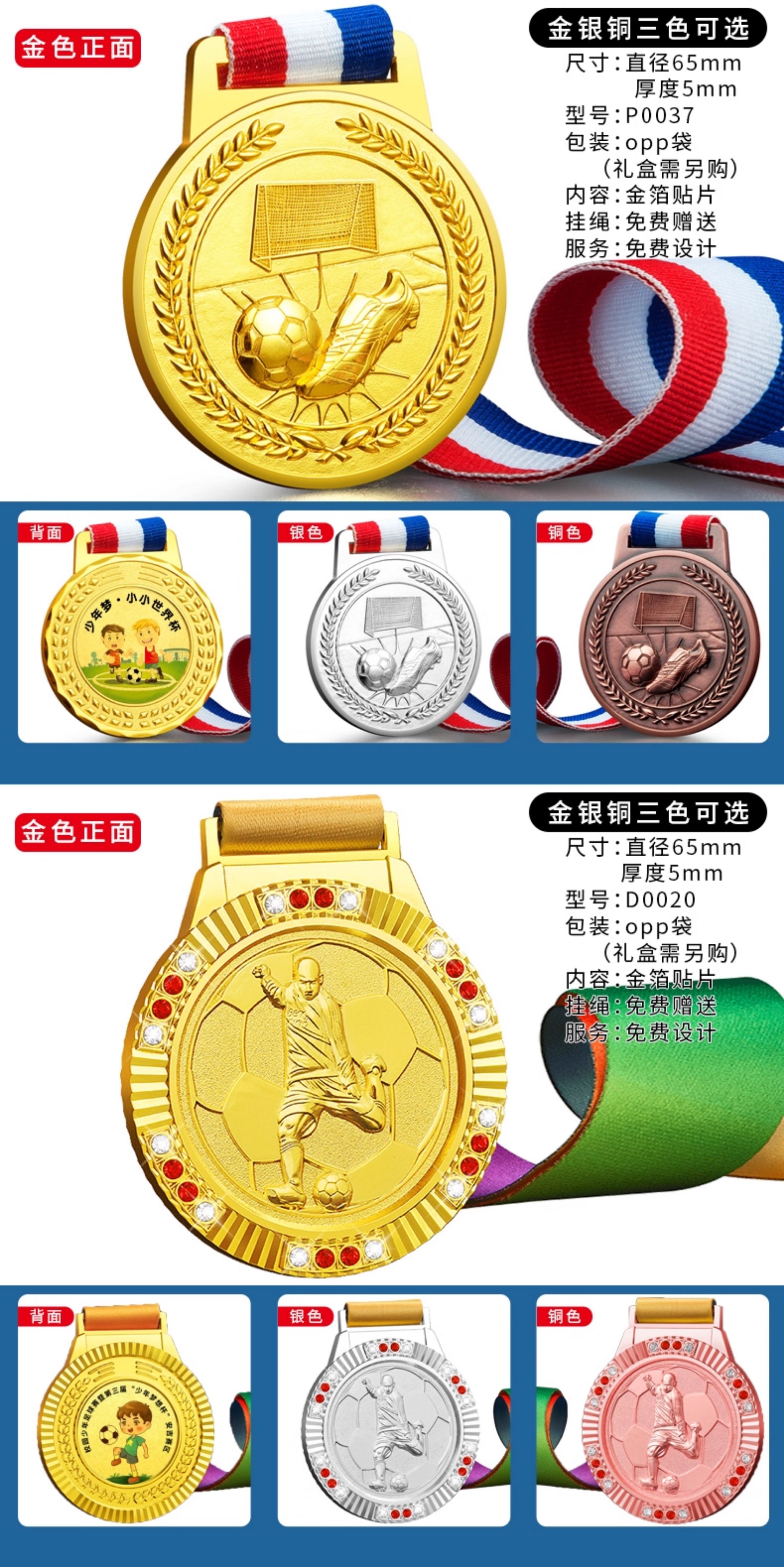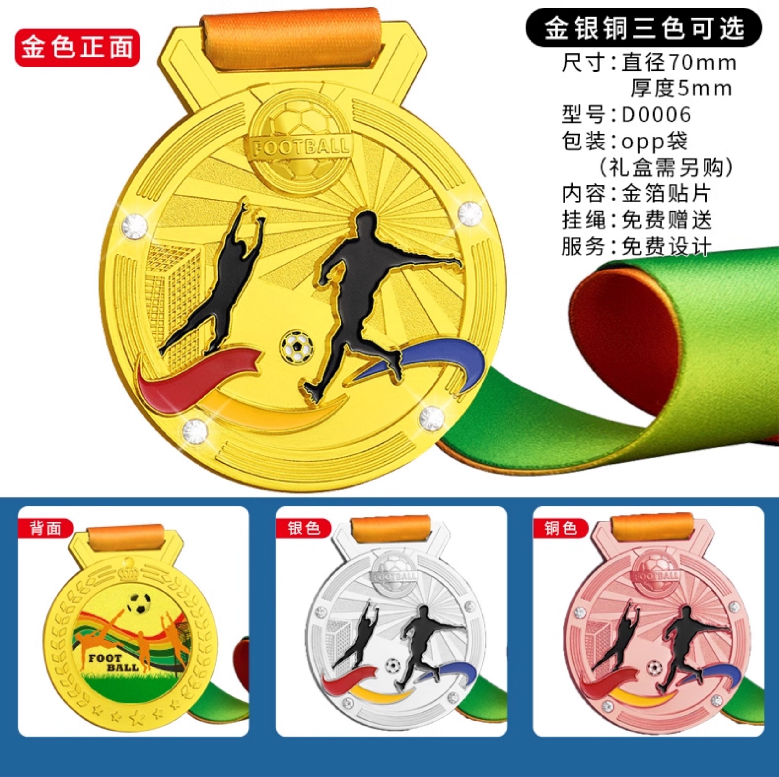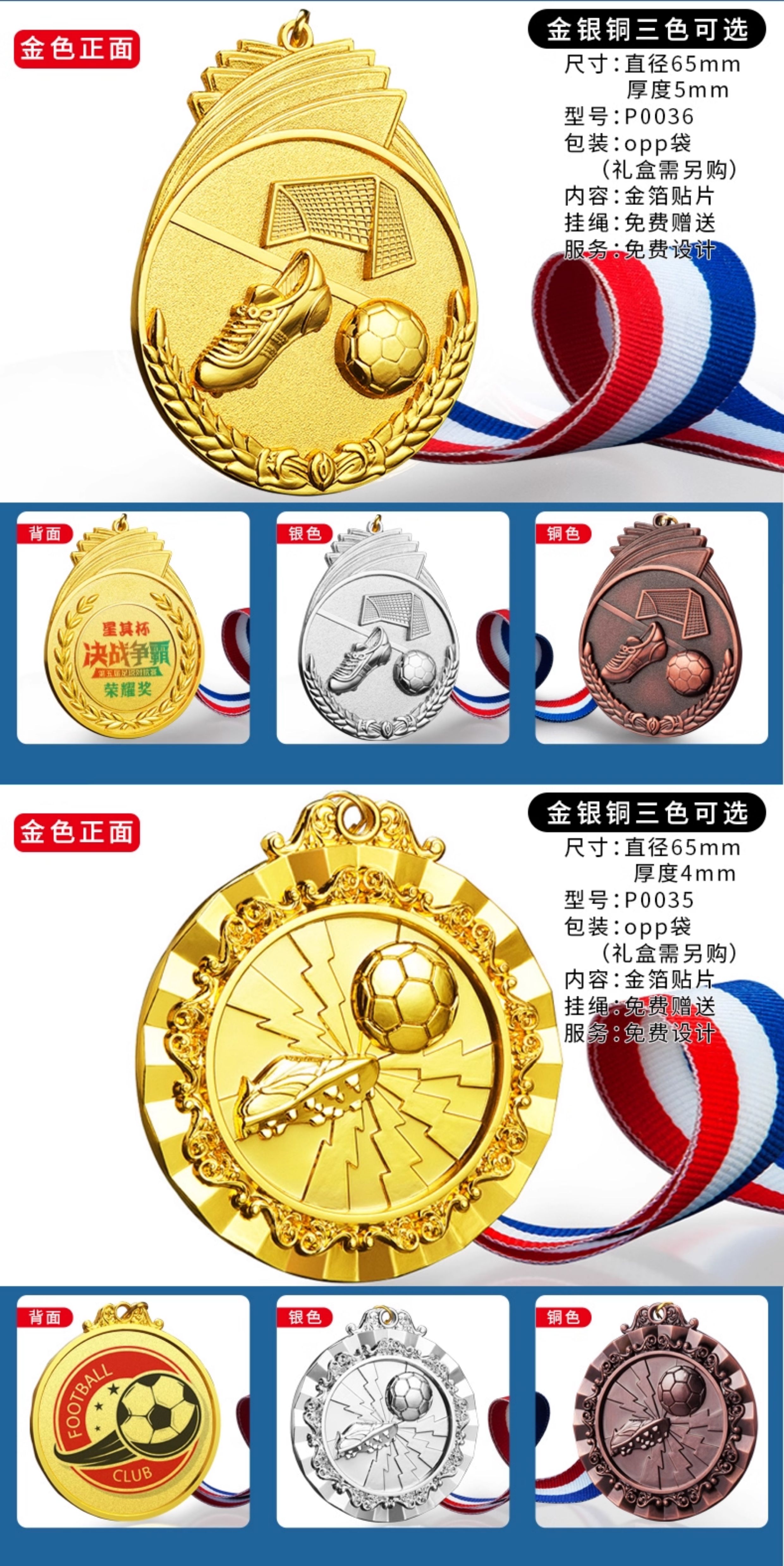 875 / 足球奖杯奖牌定制金属运动比赛挂牌定做创意儿童奖章金银铜纪念牌